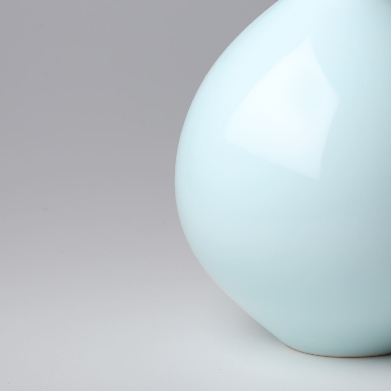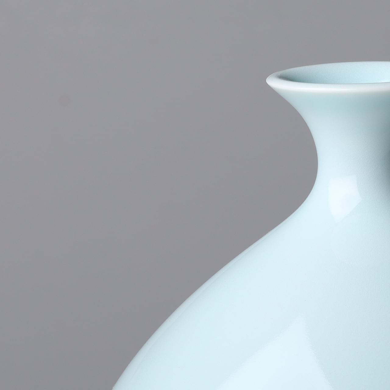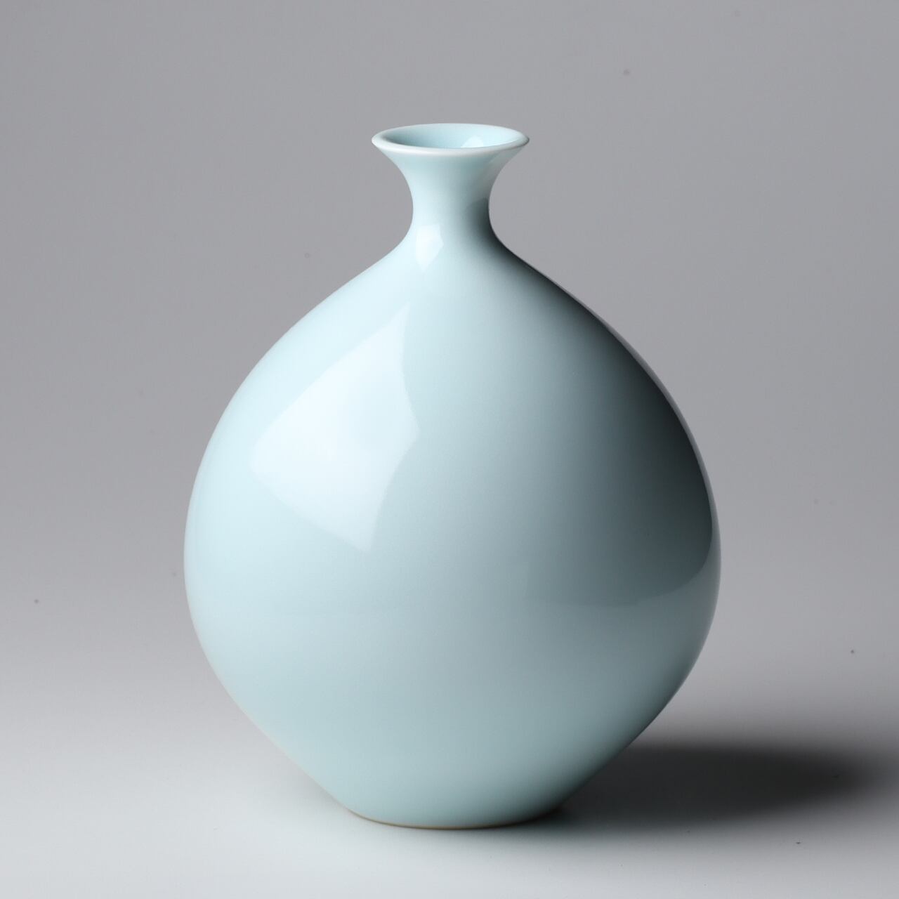 やわらかな青磁の色と膨らみのある形状が全体をやさしい雰囲気にしています。また口が細く締まっていますので凛とした佇まいの花瓶に見えます。お部屋に飾っていただくと雰囲気が変わって楽しんで頂けるものと思います。 サイズ 径 14.5cm x 高 18.7cm
