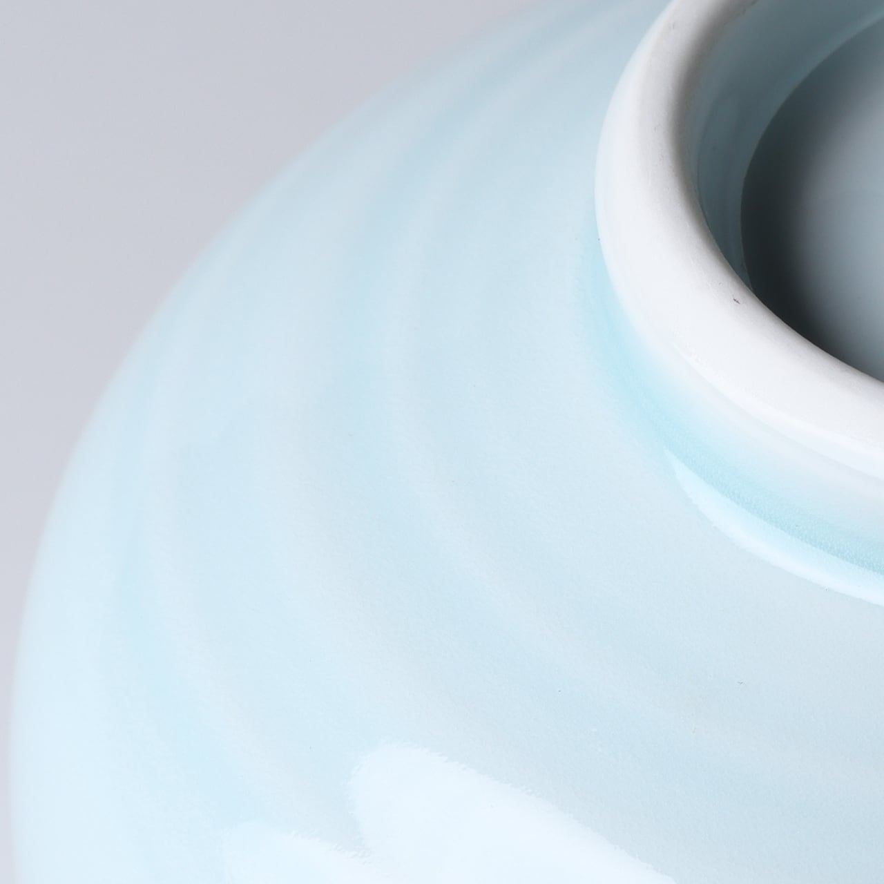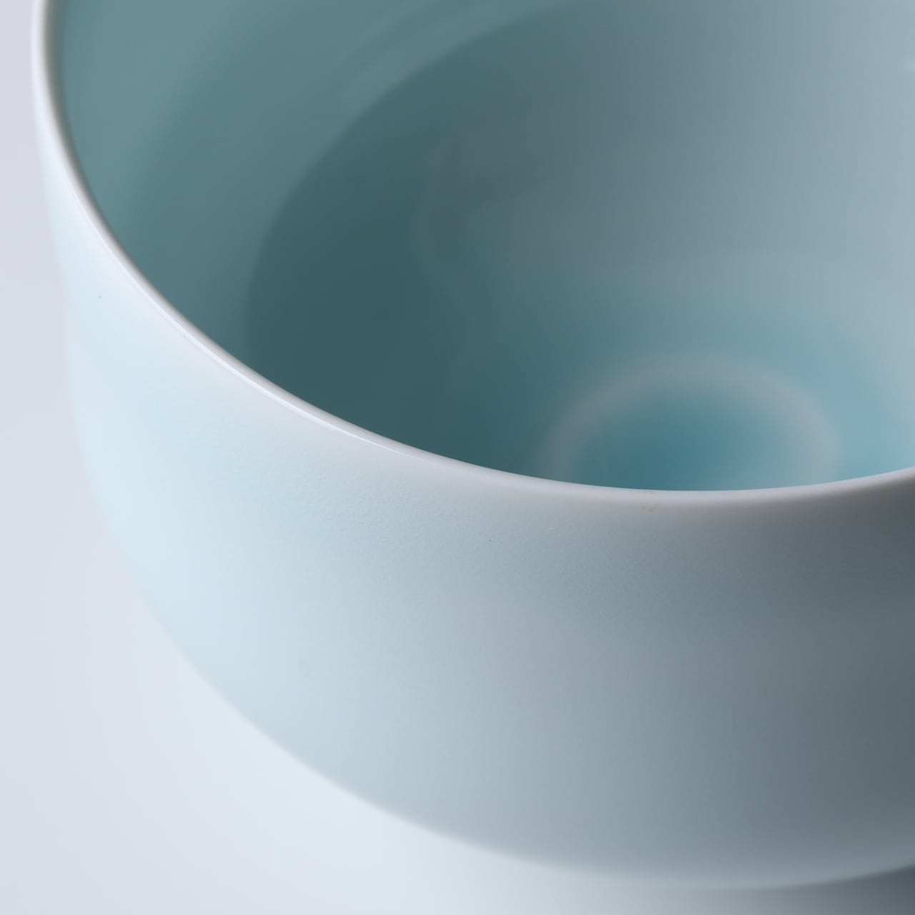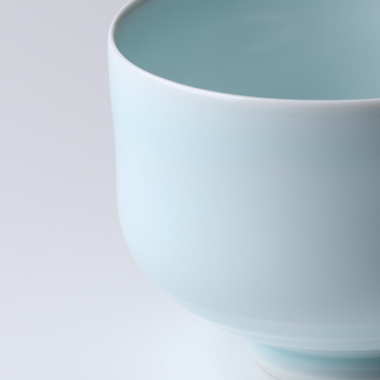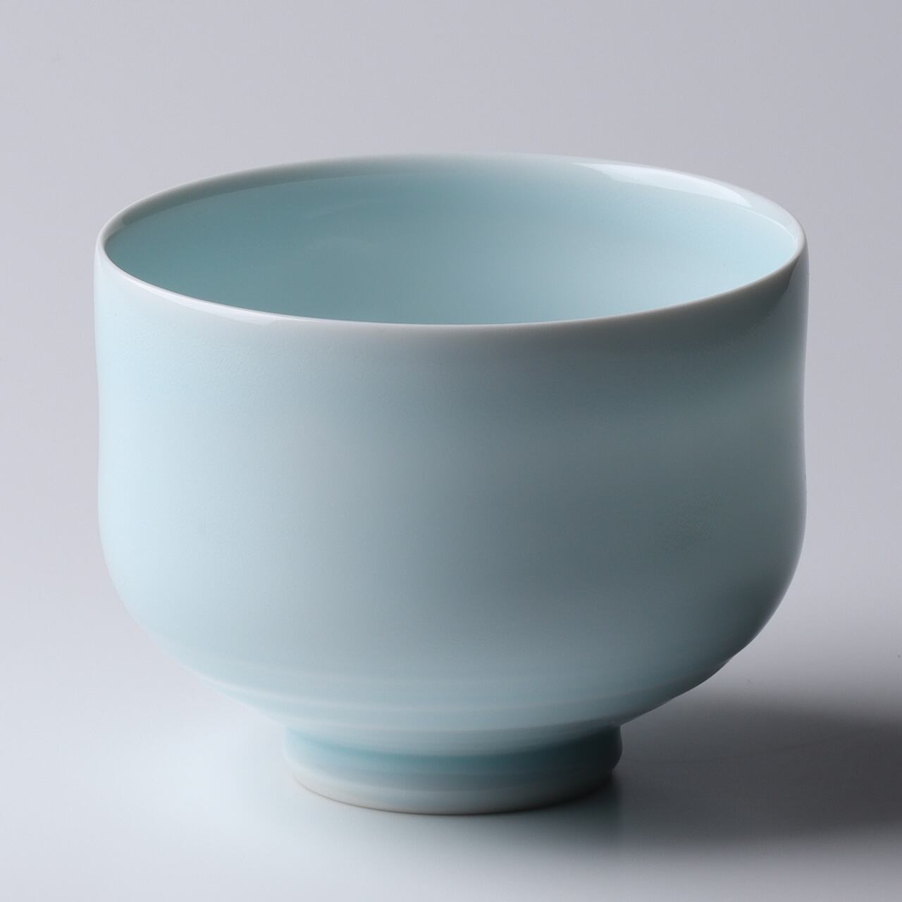 青磁の色が柔らかく焼きあがった作品です。口元も薄くやさしい仕上がりになっていて、底にたまりが出来ていて青磁の色もお楽しみいただけます。