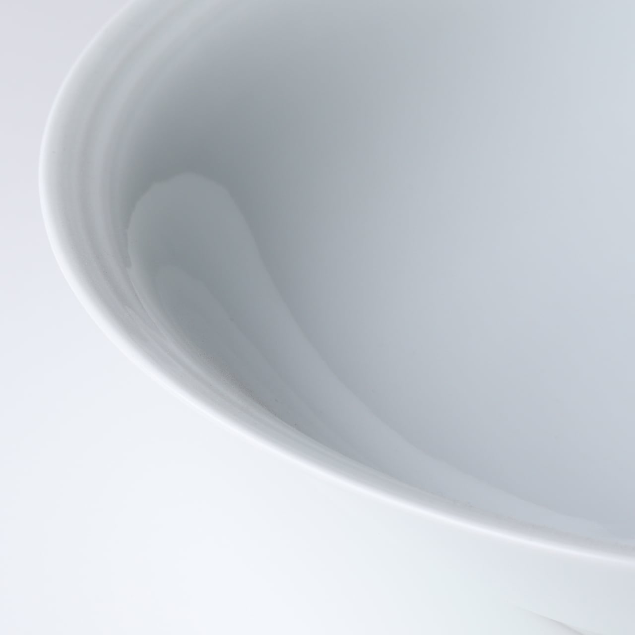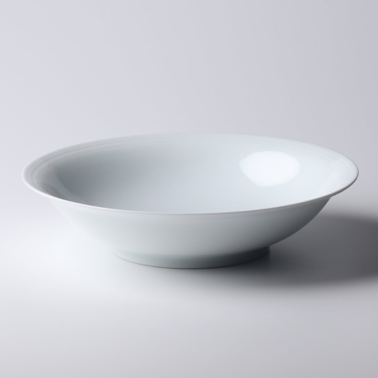 縁にうっすらと線の彫を施しています。深みもありカレー、スープ、冷麺など色々にお使い頂けて一枚あると、とても重宝するお皿です。磁器ですがろくろ成形ならではの温かみがあるかと思います。レンジも使用可能です。