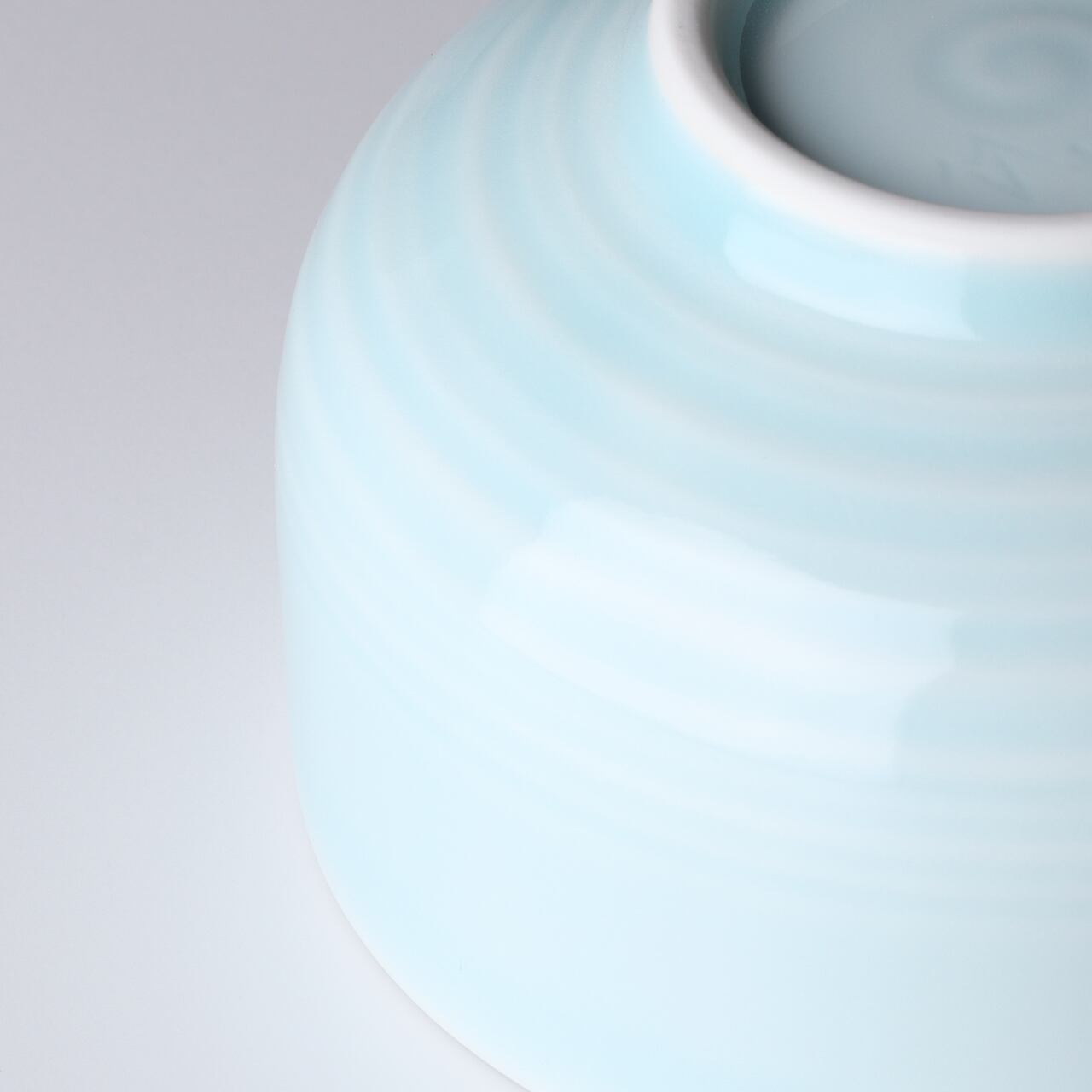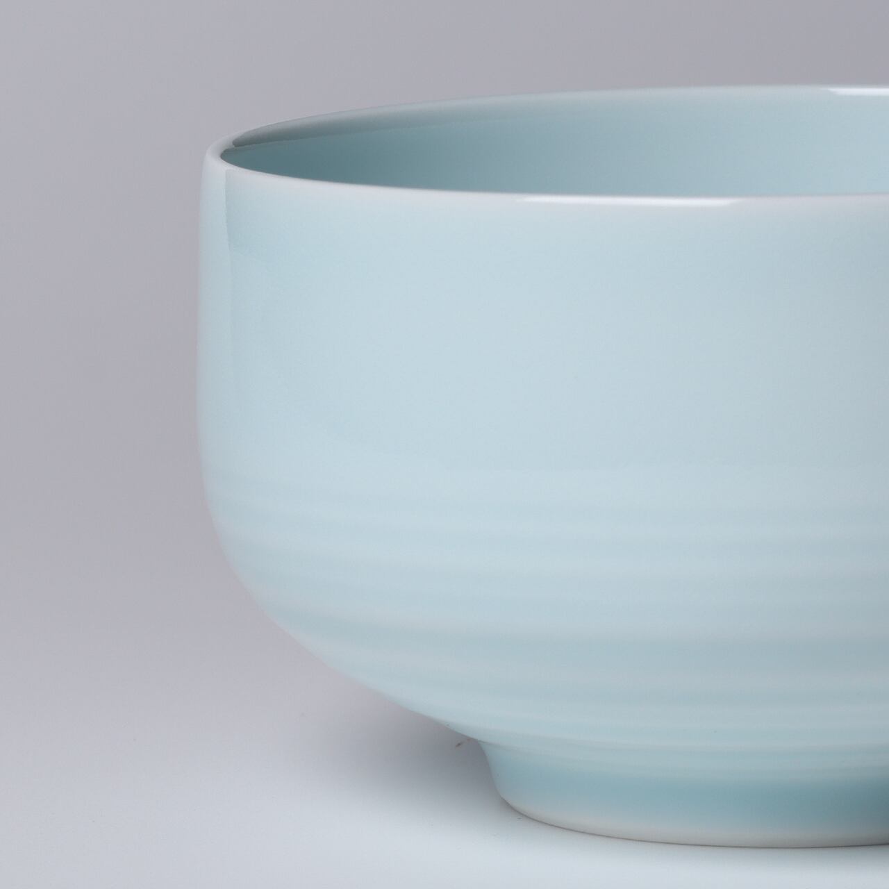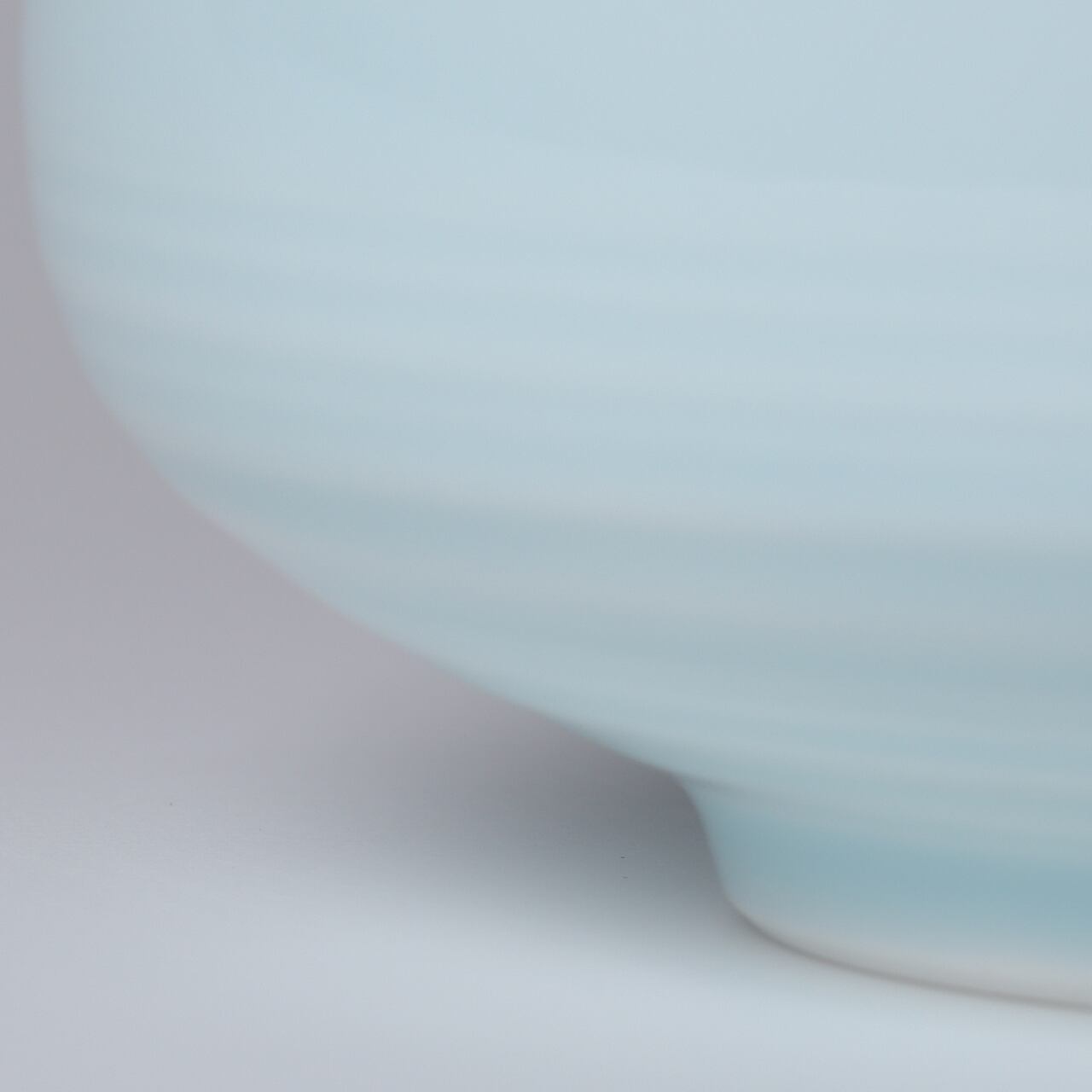 掌に乗せてお茶の温もりを感じられる小ぶりのお抹茶碗です。外の底には薄いやさしい線彫が施されて、内底には釉薬の溜まりがあって青磁の釉薬の深みもお楽しみいただけます。