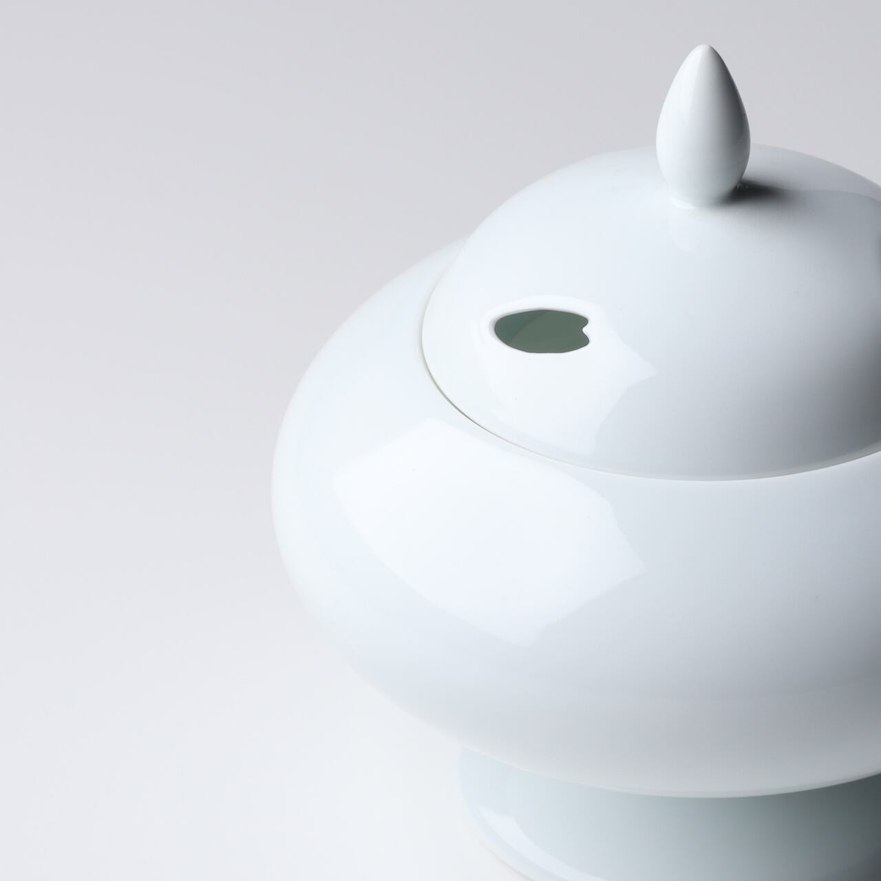 足元が高台になったお洒落な白磁香炉です。和のお部屋だけでなく洋のお部屋にも楽しんでいただけるのではないでしょうか。蓋の部分には花びらの形の彫が施されています。特上の陶石を使用した透明感ある白磁が、お部屋の中に凛とした空気を醸し出す作品です。 直径 13.3cm x 高 13cm